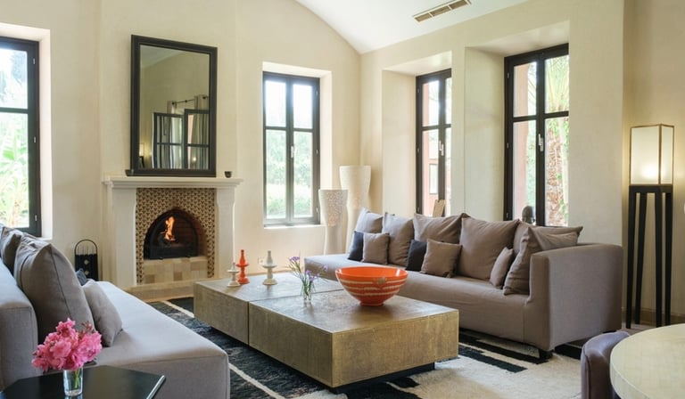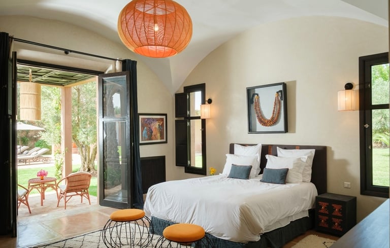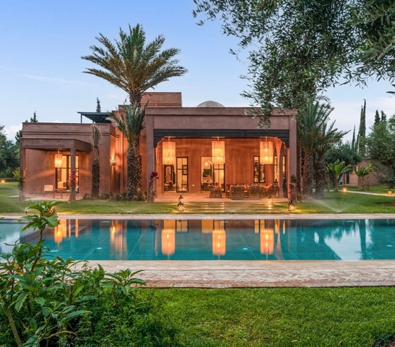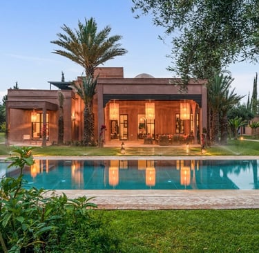 Au sein de la résidence sécurisée Jennah, gardée 24/7, cette villa beldi chic de plain-pied développe 450 m² habitables sur 4 000 m² de jardin, à 20 minutes du centre-ville et du Jardin Majorelle.